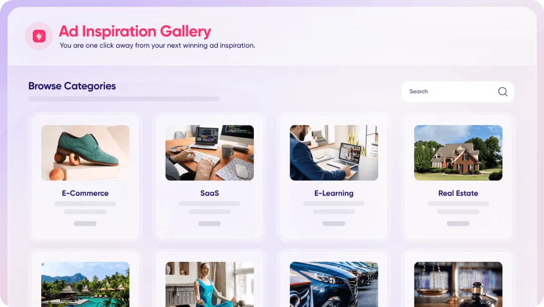 通过 AdCreative.ai 探索来自各个业务领域的成功广告的广泛分类库,为下一次高影响、以转化为重点的广告活动获取灵感。AdCreative.ai 通过提供丰富的经验丰富的广告示例,简化了创意构思过程。