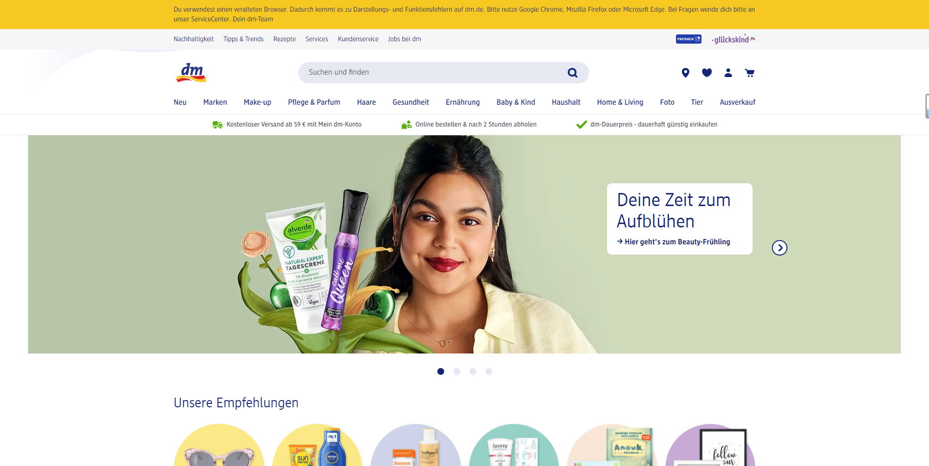dm药妆零售商平台提供了广泛的产品选择,涵盖了化妆品、护肤品、个人护理产品、健康食品等多个品类,满足消费者各种需求。