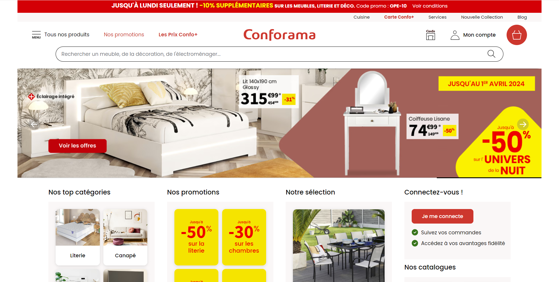Conforama提供广泛的产品选择,涵盖家具、家居用品、家电、装饰品等多个品类,能够满足消费者在家居装饰和生活用品方面的多样需求。