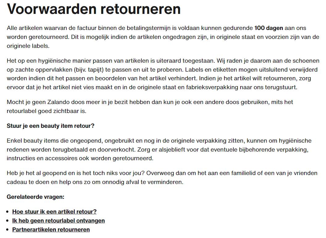 无忧退货政策:Zalando支持长达100天的无理由退货政策,并简化了退货流程。消费者无需承担退货风险,可以放心购买。