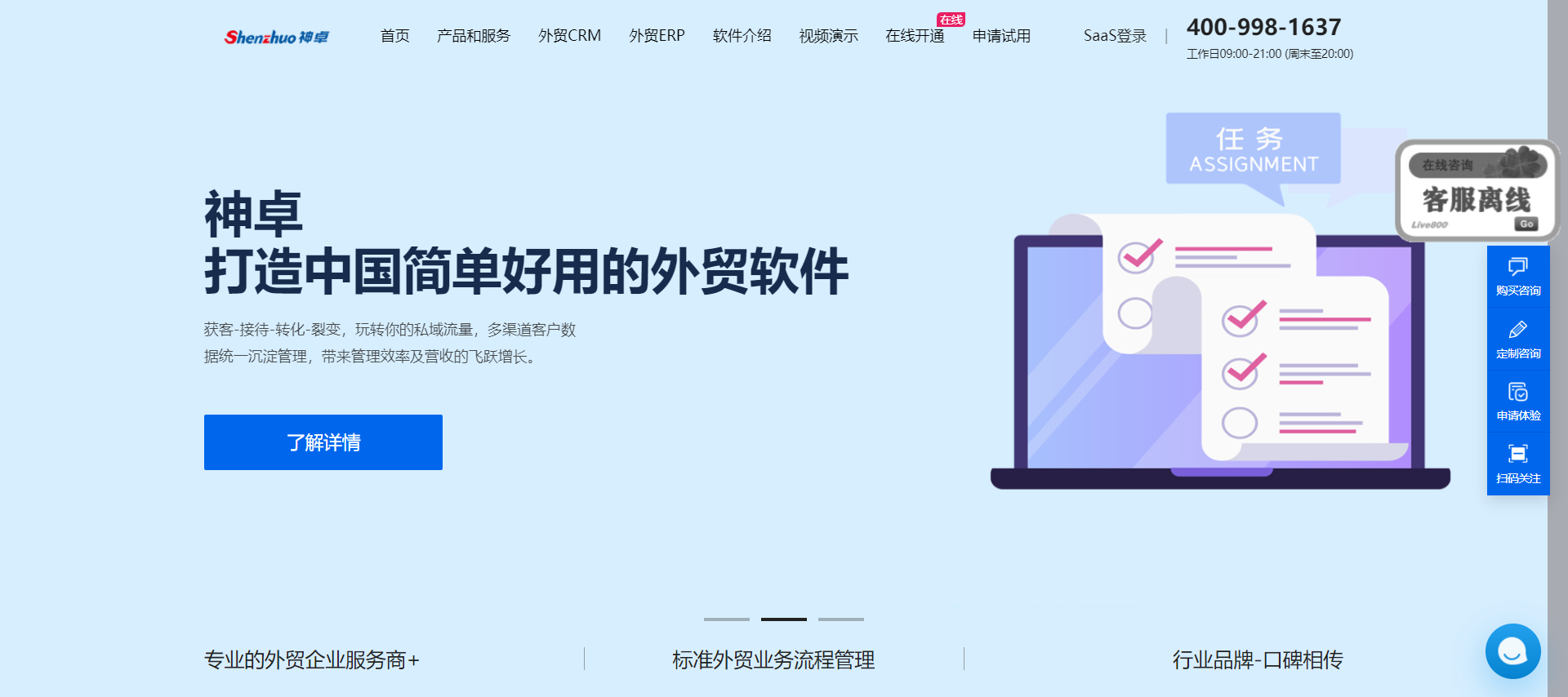 神卓外贸软件致力于助力外贸SOHO企业,让每一家中国外贸企业都能轻松应用外贸管理软件。作为外贸道路上的合作伙伴,神卓不仅仅是企业的协作伙伴,更是业务解决方案的全面提供商。产品服务覆盖从初创企业的SOHO办公到大型工贸一体化产业集团。公司专注于解决外贸流程中客户询价到海关出运尾款收取的各个环节。借助wangooe成熟的数据安全解决方案,神卓将用户体验与数据安全相结合,将客户繁琐的管理工作交给神卓,以最大限度地提升工作效率和回报率。神卓外贸软件是外贸事业成功的得力助手,为中国外贸企业提供全方位的外贸管理解决方案。